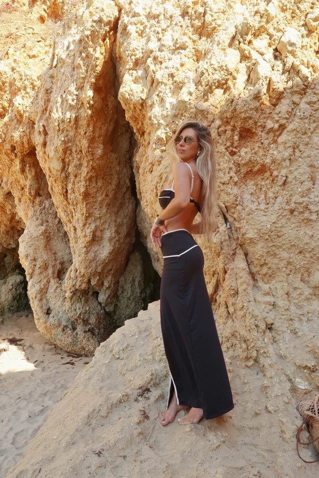 Saia Longa Hera P&B – apresenta um design bi color em off white e preto, esta saia longa destaca-se pelo detalhe único, uma assinatura exclusiva. Confeccionada para proporcionar conforto e elegância, é a peça ideal para combinar com nosso biquíni, criando um look harmonioso e cheio de personalidade. Perfeita para ocasiões especiais ou momentos à beira-mar.